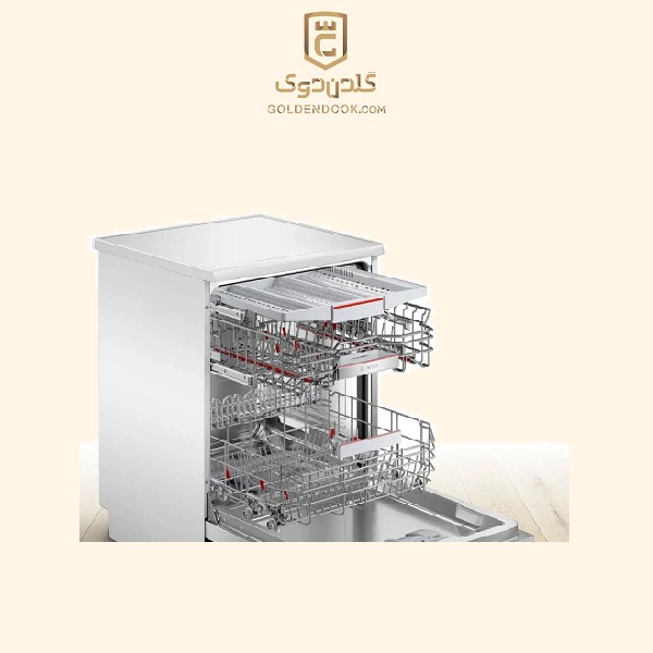 ماشین ظرفشویی بوش مدل SMS6ECW57E یکی از محصولات سری 6 این برند است که با ترکیب طراحی چشم‌نواز، عملکرد کم‌صدا و امکانات هوشمند، تجربه‌ای حرفه‌ای از شستشوی ظروف ارائه می‌دهد. بدنه سفید دستگاه با استفاده از استیل مقاوم و ضدزنگ ساخته شده تا در برابر رطوبت و شرایط محیط آشپزخانه دوام بالایی داشته باشد. ابعاد 600×600×850 میلی‌متر و وزن 54.6 کیلوگرم، نصب آن را در فضای استاندارد کابینت‌ها آسان می‌کند. درب دستگاه تا زاویه 90 درجه باز می‌شود و دسترسی کامل به فضای داخلی را فراهم می‌سازد.