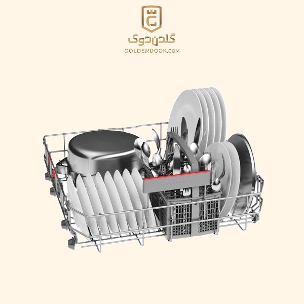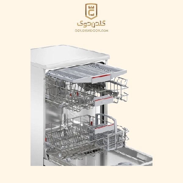 محفظه داخلی دستگاه از استیل ضدزنگ ساخته شده که در برابر رطوبت و تماس مداوم با آب مقاومت بالایی دارد و در طول زمان دچار زنگ‌زدگی یا افت کیفیت نمی‌شود. این مدل به سه سبد اصلی شستشو مجهز است که امکان تنظیم ارتفاع بین آن‌ها وجود دارد تا بتوان ظروف بزرگ‌تری مانند قابلمه و ماهیتابه را نیز به‌راحتی در دستگاه جای داد. علاوه بر این سه سبد، یک سبد مجزای مخصوص قاشق و چنگال نیز در نظر گرفته شده است تا نظم چیدمان افزایش یابد و کیفیت شستشو بهبود پیدا کند. پایه‌های ضدلغزش دستگاه نیز از حرکت ناخواسته آن در زمان شستشو جلوگیری می‌کنند.