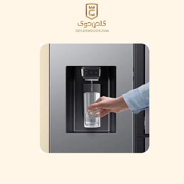 بله، آبریز و یخ‌ساز روی درب دستگاه تعبیه شده و دسترسی سریع به آب سرد و یخ را فراهم می‌کند.